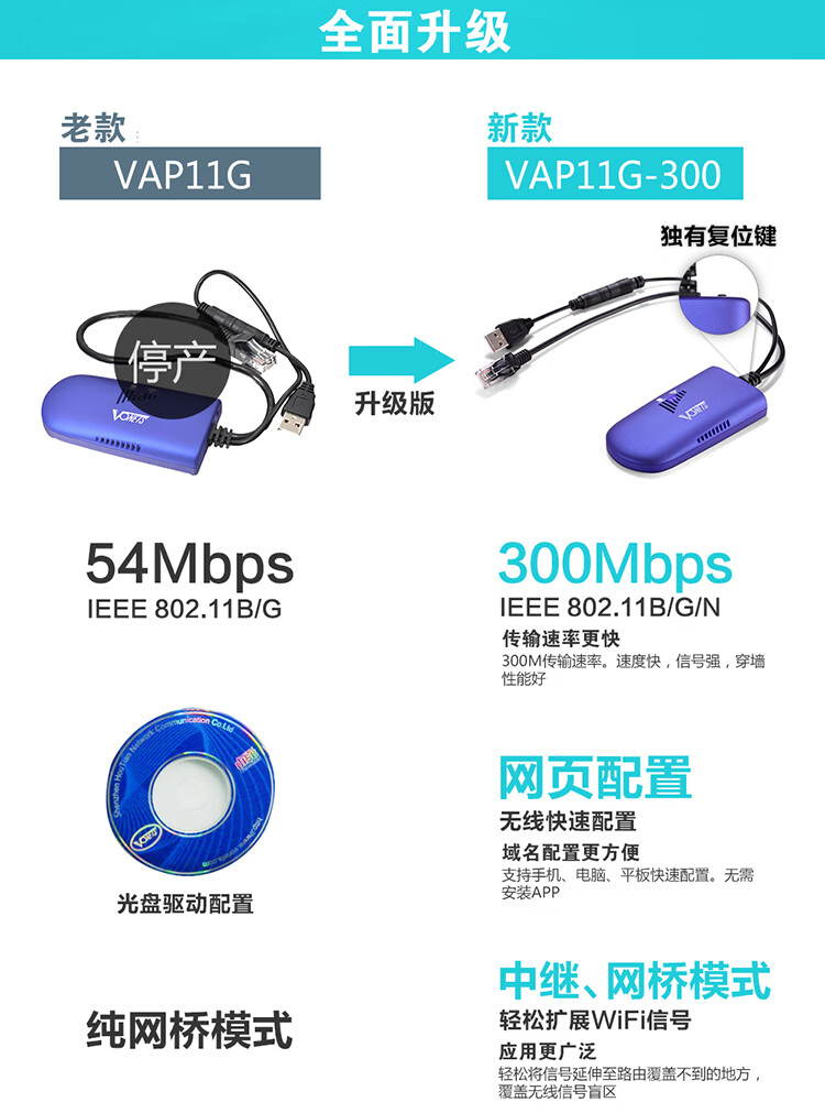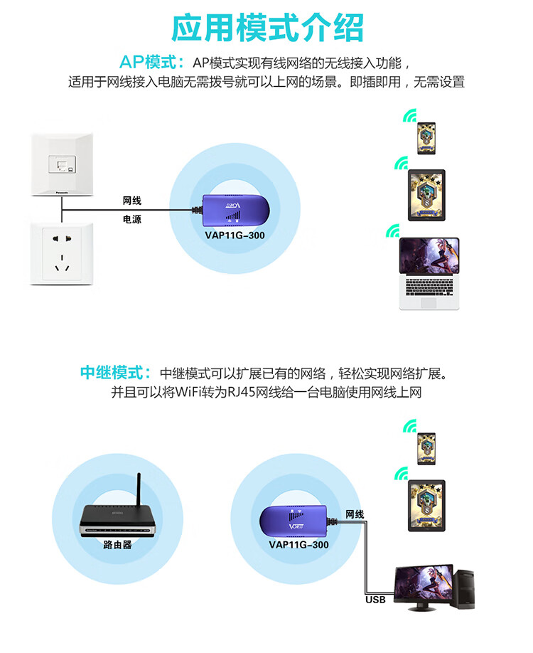 VONETS无线WiFi转有线网桥设备联网通信信号中继放大增强AP扩展器VAP11G-300工业监控工程接收信号转有线 VAP11G-300 标配