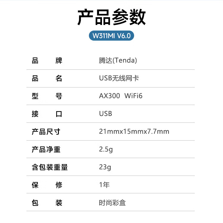 商品名称:Tenda腾达 WiFi6免驱动usb无线网卡台式机专用 wifi接收器台式电脑笔记本主机网络wifi发射 内置天线